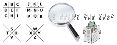 The solver calls out letters, one-by-one. If a called letter appears in the solution, all occurrences in the solution are filled in. If the letter does not appear in the solution, the secret writer adds one element to a drawing of a gallows (complete with a stick man). A complete rendering takes eleven moves. If the hangman drawing gets completed (eleven incorrect letters), then the secret writer has won. If all letters of the word are revealed before this happens, then the solver wins. |
