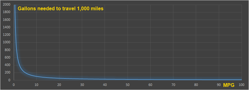 Fuel efficiency is not the most appropriate or intuitive method for measuring fuel consumption. I’ll give some examples later, but the fundamental reason is that we’re trying to measure consumption, and when measuring miles per gallon, the consumption term is on the denominator and so this results in a reciprocal proportional representation. The human mind is much better at dealing with linear relationships (especially when dealing with comparison situations). |