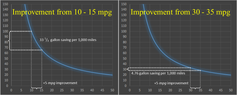 Because of this non-linear relationship, equal increases in MPG improvements do not equate to equal improvements in gas savings.