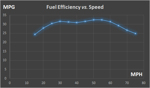 Obviously, every make of car has different profile curves, but here is some data based on average information obtained from US Department of Energy statistics. Graphed out (with speed on the x-axis and fuel efficiency on the y-axis) we can see how, in this case, the highest efficiency of the vehicle is obtained around 50-55 mph. Faster than this, aerodynamic drag becomes more important, and below this speed, gearing and other losses don’t make the most efficient use of the engines output. If you were going to drive a one particular fixed speed to maximise your range then, in this particular car, it would be most advantageous to travel at a speed of 50-55 mph (we're ignoring here any effect of gradient or wind). |