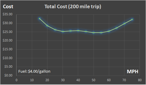 This can be seen clearly on the graph on the right which shows a fictitious trip of 200 miles. I've used an estimate of $4.00/gallon to set some context but, of course, when comparing the realtive values, the price of gas is not important. We can see that the graph has a minimum at the 50-55 mph region at just less than $25. The curve is pretty flat from the region 30 mph up to 60 mph, rising slightly in the middle (probably because at 40 mph the speed is still too slow to efficiently engage the top long gear, so the engine is revving higher than its optimal peak efficiency). Above 60 mph, even the top gearing and efficiency of the engine starts to battle aerodynamic drag, and the engine has to generate more power. |