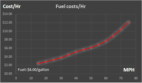 When we travel faster we cover distance in a shorter time, but this comes at the penalty of higher fuel consumption. To the right is a graph of the fuel cost based on time, when traveling at constant speed. (This graph is just the fuel consumption rate gallons/hour multiplied by the cost of fuel, in this case, $4.00). The graph goes upwards and to the right; the faster you travel the faster the fuel burn rate (this would be the case even if the fuel efficiency rate were constant with speed. The fact that fuel efficiency changes with speed adjust the gradient of this curve). |