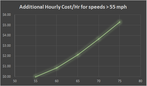 We know that the most efficient speed to travel is 55 mph. What happens if we travel faster? As we have seen, our consumption rate gets higher at higher speed. To the right is the delta (difference) between the hourly rate of traveling at 55 mph (the most efficient speed) compared to other speeds. If you elect to travel at 60 mph, this will cost you an additional $0.85 per hour of travel. If you travel at 65 mph, this works out at $2.11 per hour. At 70 mph, this increases to $3.66 per hour, and finally, at 75 mph, the additional cost is $5.31 per hour. (I'm ignoring completely, the concept of travelling slower than 55 mph. This takes longer and is more inefficient. A lose-lose situation!) |