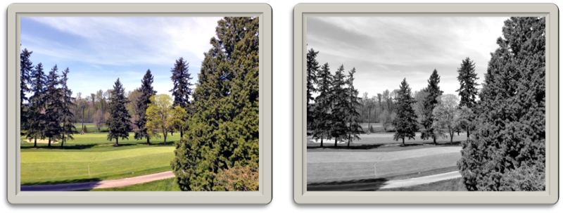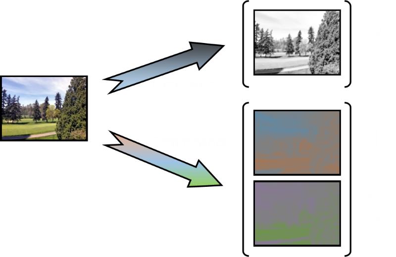 Below is a series of images simulating a color TV picture. For each, the Luminance signal (black and white) remains the same, and displayed are series a degrading resolutions of Chrominance components. The third image shows how they look when combined.