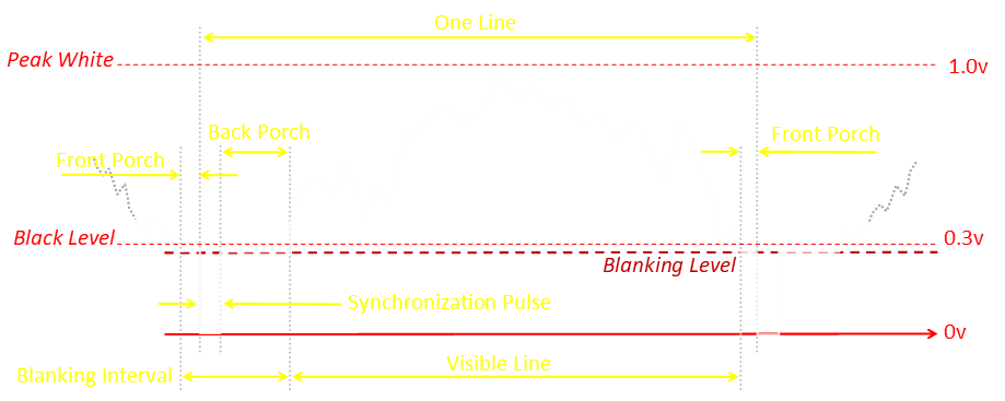 To stop subsequent lines skewing from side to side through timing drift, at the start of each scan line is a synchronization pulse. This reminds the rendering receiver exactly when each line needs to start. This synchronization pulse is 4.7µS long. Just before this pulse is an even shorter Front Porch gap of 1.5µS (to allow older TVs to stablize voltages and prevent line interference), and downstream of the synchronization pulse is a longer Back Porch, at the blanking level voltage. As we will see later, this back porch has an additional use for color TV signals. During the entire time between the front porch, through the synchronization pulse through the the back porch, the signal is below the blanking internal, and the electron gun is off. It is during this blanking interval that the gun sweeps around to back ready to draw the next line.