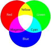 Our eyes have two type of light detectors: Rods and Cones. Rods capture light and dark signals, and cones detect color (wavelength). The average retina contains approx 120 million rods, and about 6 million cones. Of this 6 million, these are divided into groups that are sensitive to red, green, and blue light. (The much larger number of rods means the eye has far more resolution to brightness than color; this becomes important later). As we learned in school, using the additive color principle, other colors can be created by mixing, in various quantities, red, green, and blue light. |