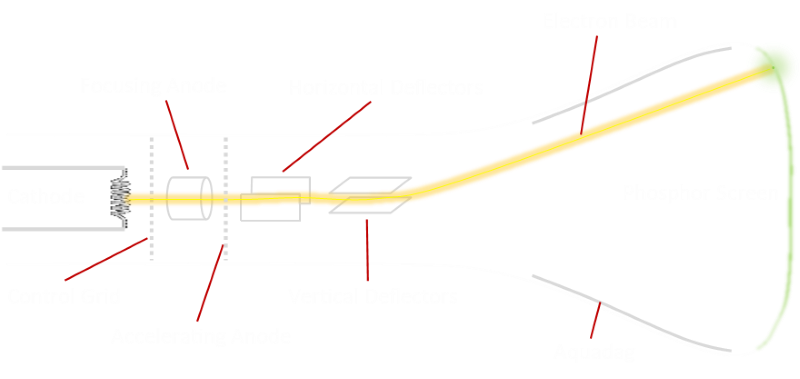 By adjusting these parameters it's possible to control the beam and move it anywhere on the screen, and specify it's brightness. By applying alternating parameters, the beam can be steered, and swept over the screen.