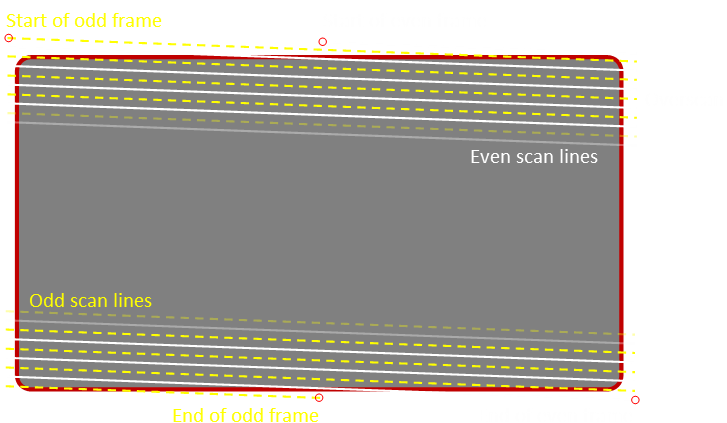 In odd frames of the picture, lines start at the top left, and only half a line is drawn as the last line of the frame. Even frames start their first line half-way across the screen, and finish in the lower right. Because of over-scan (described early), these half-lines are never seen.