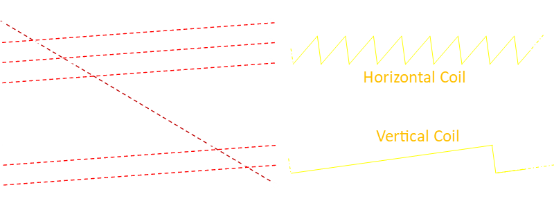Through the application of two sawtooth waves to the deflection coils (a high frequency one applied to the horizontal coils to sweep the beam at uniform speed from left to right, followed by a rapid return to the left, and a lower frequency wave applied to the vertical coils to slowly move the beam down the screen, then back up to the top), the beam can be directed to sweep over the screen as a series of lines.