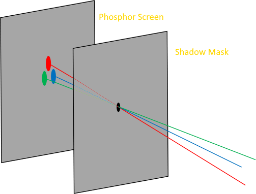 Note: These triads are not pixels in the traditional sense that we know from digital displays, they are simply ways to produce color, and the shadow mask is there to simply prevent the incorrect beam hitting the incorrect phosphor.