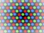 Thousands of patches of these phosphors were arranged, in a triangular pattern, called a triad, to the inside of the screen. As the dots were very small (fractions of millimeters), when illuminating, they merged with the light from the other elements of the triad to make a color picture. Unless you were very, very close the the screen, the individually light Red, Green, and Blue dots would look like white light. |