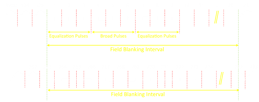 These trains of pulses are more complex and comprise a series of pre-equalization pulses, followed by field sync Vertical pulses (called broad pulses), followed by post-equalization pulses before the scan lines for the next frame are delivered.
