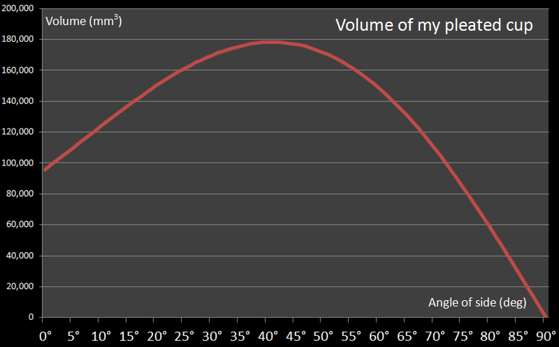 Plotting the volume of the cup against the angle of the side reveals the following theoretical curve: