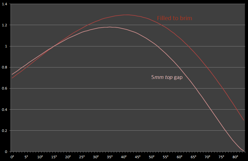 At 15° we see the ratio is 1.0. With the particular dimensions of the cup I am using, the peak carrying capacity is 1.296 x that obtained at the default angle, and this can be achieved by setting the walls to an angle of 41°