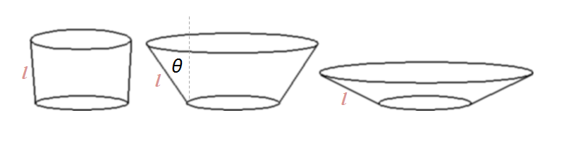 Using a little trigonometry, the new diameter of the top of the cup can be calculated. If we use θ to describe the angle of the wall of the cup from vertical then, because the side of the cup l remains fixed, the top diameter can be calculated. (The default angle of my cup was not zero degrees, but 15 degrees, more of this later …)
