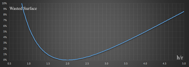 On the y-axis I've plotted the efficiency of the can by showing a normalized value of the excess material needed (as a percentage of the minimum surface area). Cans that have a higher, or lower, aspect ratio than the optimal require more surface area to contain the same volume (and thus more material).