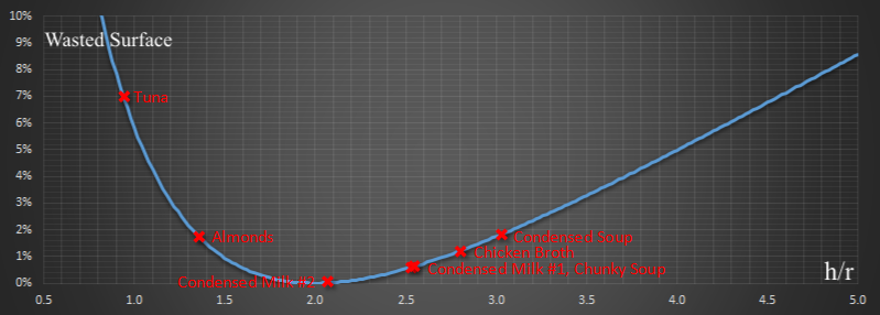 Out of all the cans in my pantry, the tuna is the most inefficient, and the condensed milk #2, Eagle Brand, is pretty close to the perfect ratio. Well done guys! Your product is sold in the most efficient can possible.