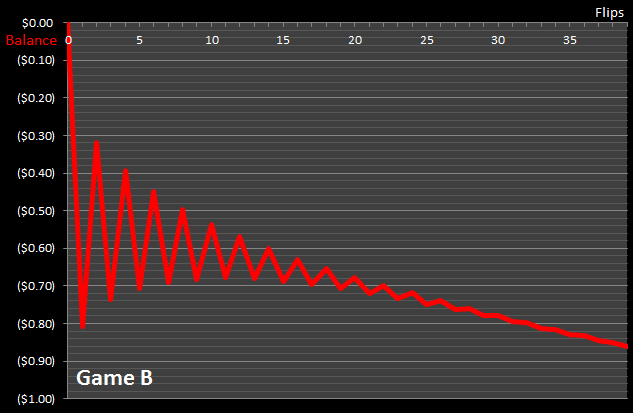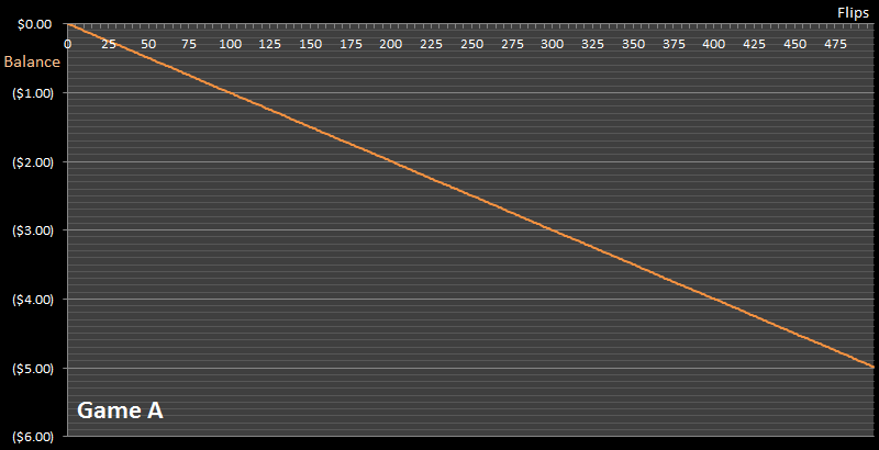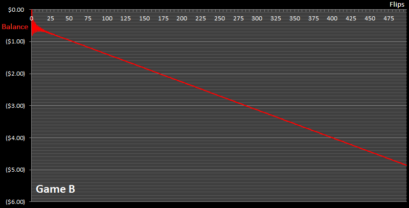 Game A is also played with a coin but this time it’s played with an unfair coin, and the bias is against the player.