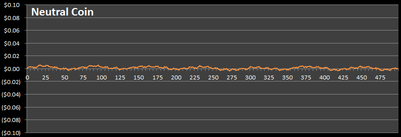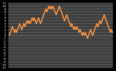 Let’s start our investigation with discussion about a neutral game. Imagine we have a totally fair and unbiased coin. This coin lands 50:50 heads/ tails when flipped. We start off with zero dollars and flip the coin. If it lands heads, we win a dollar. If it lands tails, we lose a dollar. Then we play the game again, and again. |