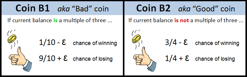 For this game we have two (different) coins we could flip instead of one. To determine which coin to flip, we look at the current value of our cash balance. If the money we have is currently a multiple of three we flip the first coin (Coin B1). If the money in our current balance is not a multiple of three we flip the second coin (Coin B2).