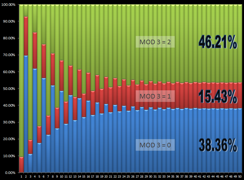 Let me explain: If the current balance happens to be a multiple of three, you’re going to be flipping the bad coin. It’s much, much more likely that you’ll lose the flip of the bad coin and end up back at a modulus one below your current state. So now you’re in the state of the modulus one before the multiple of three and you’ll be flipping the good coin. There is a higher probability of winning this game, so you’ll end up back at a multiple of three. As you can see, it’s more likely you’ll be oscillating between these states than progressing simply up or down! This adjusts the weightings about how likely you will be in each of the moduli.