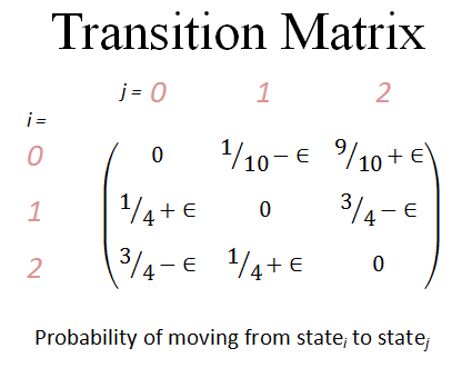 Let’s define the three states of our Markov model to be the Modulus (3) of the current balance (The remainder if we divided the balance by three). It can have the values { 0 , 1 , 2 } Here is the Transition Matrix showing the probabilities of moving from statei to statej As you can see, each row is stochastic and adds up to 1.0 (something has to happen on each coin flip), and there are zero’s on the leading diagonal (it’s not possible to stay in the same state). Each element of the matrix represents the probability of moving from that modulus state to another. |