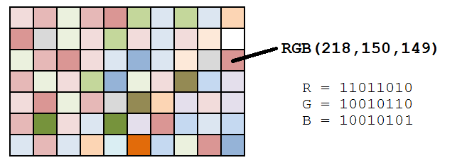 |  | The diagram on the left shows how each pixel of an image can be described by three 8-bit binary numbers. |