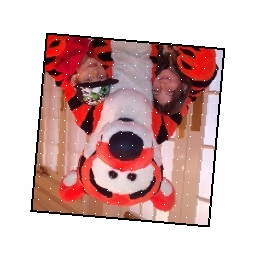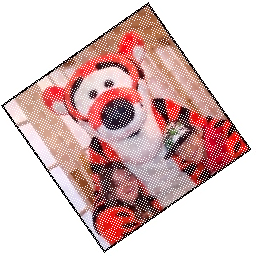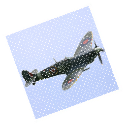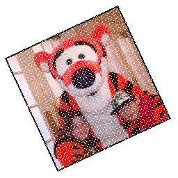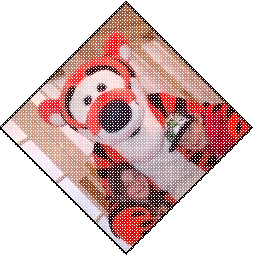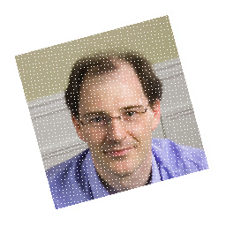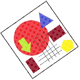 |  | Here is the result with a rotation of θ = 15° It's certainly worked. The image has been rotated, but what are all those dots? This is a problem called aliasing. It's the same reason that we see jagged staircases on lines drawn on low resolution screens at angles other than horizontal and vertical. Raster screens are digital, and pixel boundaries are at quantized locations. |
