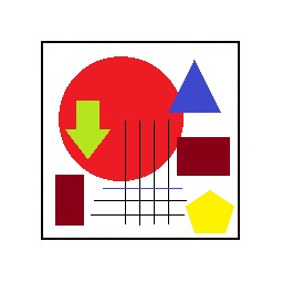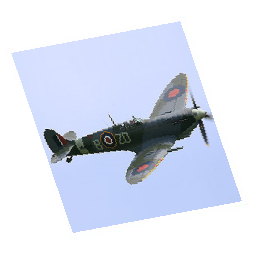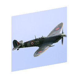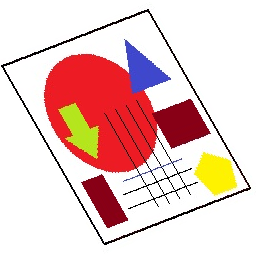 Below are rotations of a test card of random shapes (so you can see the effect of the shears), a Spitfire, and Tigger. For each image, I've shown the source, the results of applying the three shear matrices in order and, for comparison, the image produced by the standard 2D rotation matrix (sometimes called a rotation by selection).