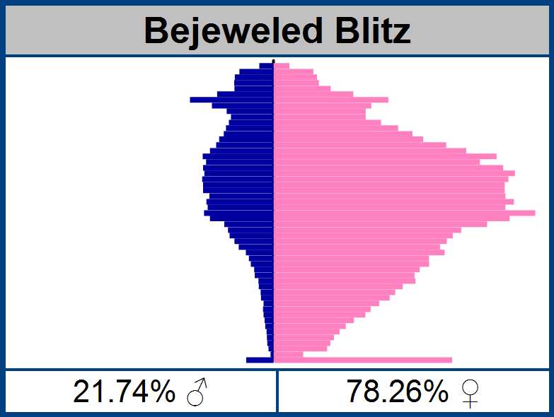 Each of the charts in this article have been generated from scraping data from facebook based on the number of people (in the USA in this case), who have affinity in some form with the application (such as being a fan or user of the application). Because of the different denominators and sizes of each keyword population, each graph has been normalized so that the ‘area’ under each curve is the same. In this way, the shapes can be compared to contrast the demographic audience of each keyword. The demographics for Bejeweled Blitz players mirrors the demographics typically seen in the industry for casual download games players, which are typically biased towards the middle-aged female segment. For Bejeweled players on facebook, over 78% are female, with an impressive bulge in the curve between the ages of 25 and 50. |