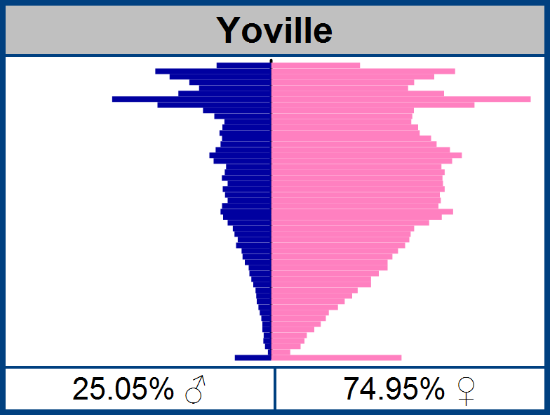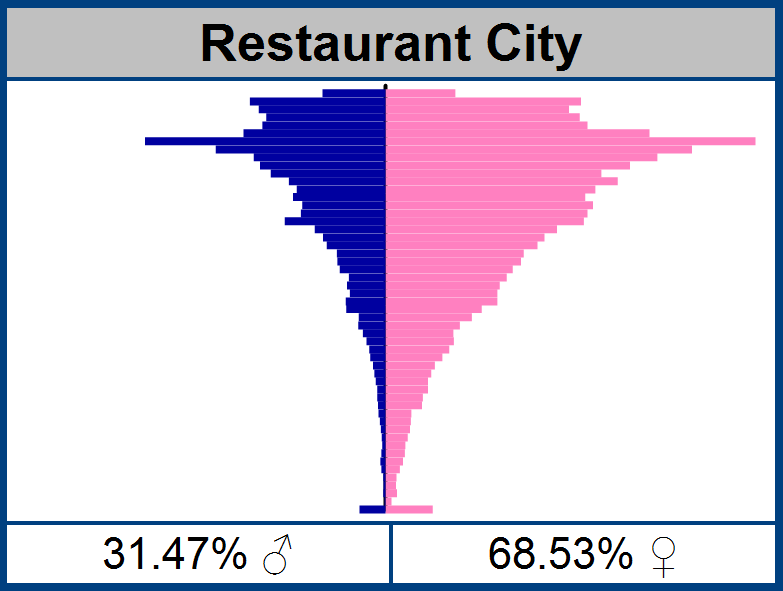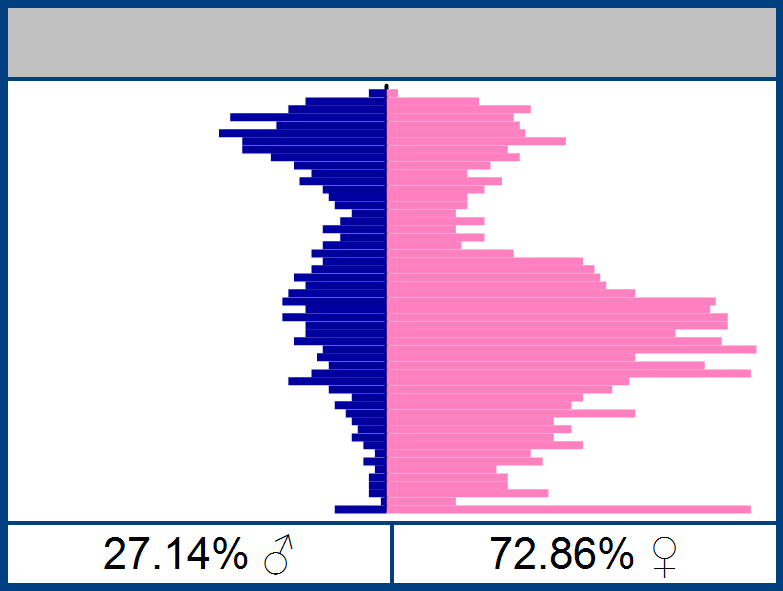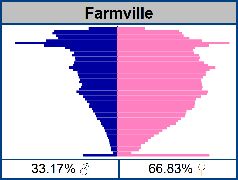 Below is a chart of the demographic profiles of Bejeweled Blitz™ players on facebook (in the US). The vertical axis shows age, with 13 years of age at the top, and 65 and above at the bottom. There is a separate row for each distinct age between these two limits. Female fans are shown on the right with pink bars, and male fans to the left with blue bars.