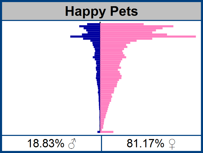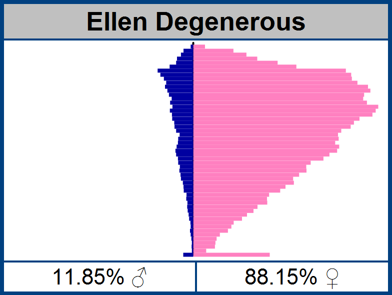 Below are charts for the fans of the Oprah Winfrey Show, and the fans of Ellen Degenerous. At first glance they appear similar at 88-89% female fan base, but if you look closer you can see that Oprah’s audience is more mature, peaking in the late 30’s, while Ellen seems to appeal to women in their 20’s.