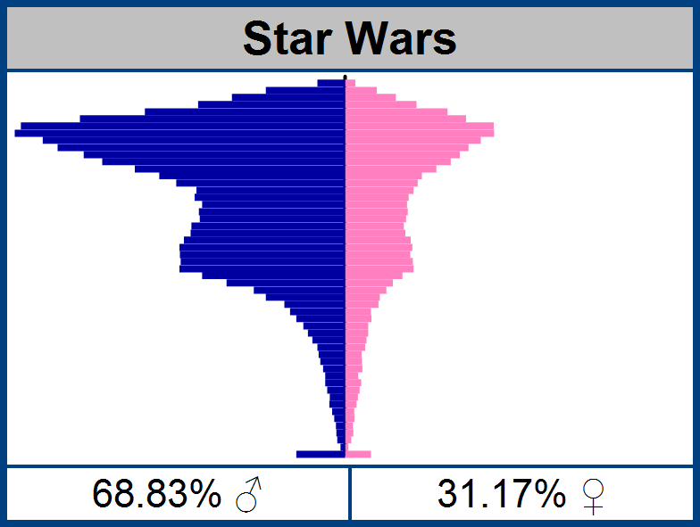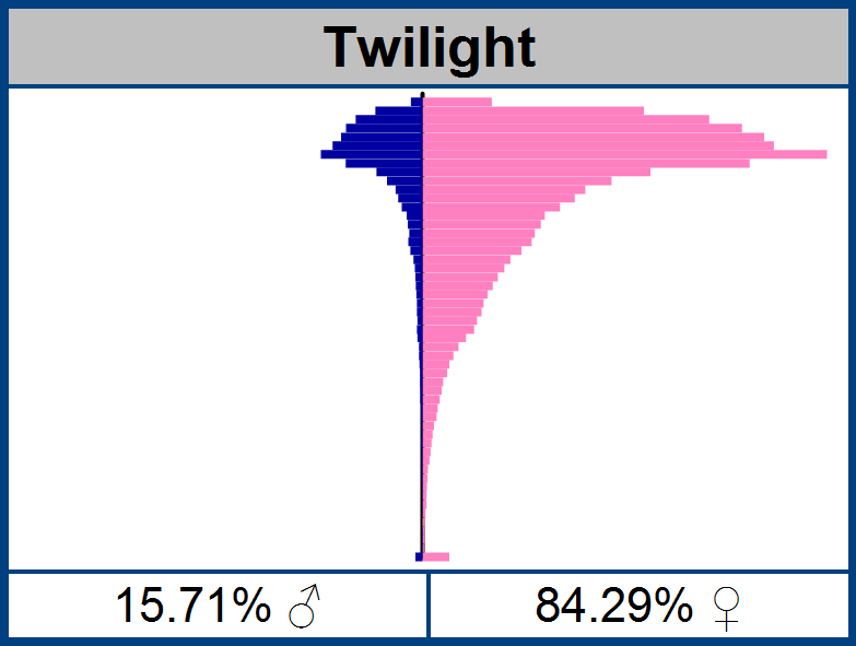We don’t have to limit ourselves to just games and applications; people become fans of other things on facebook. For instance, below are charts showing the demographic curves for fans of Star Wars™ and Twilight™. The curve for Twilight should be no surprise to anyone who shares a house with a teenage daughter. The curve for Star Wars is interesting because of the ‘double hump’. There are distinct peaks for fans of the original trilogy (people now in their late 30’s and 40’s), as well as for the younger crowd groomed on prequel episodes and the Clone Wars.