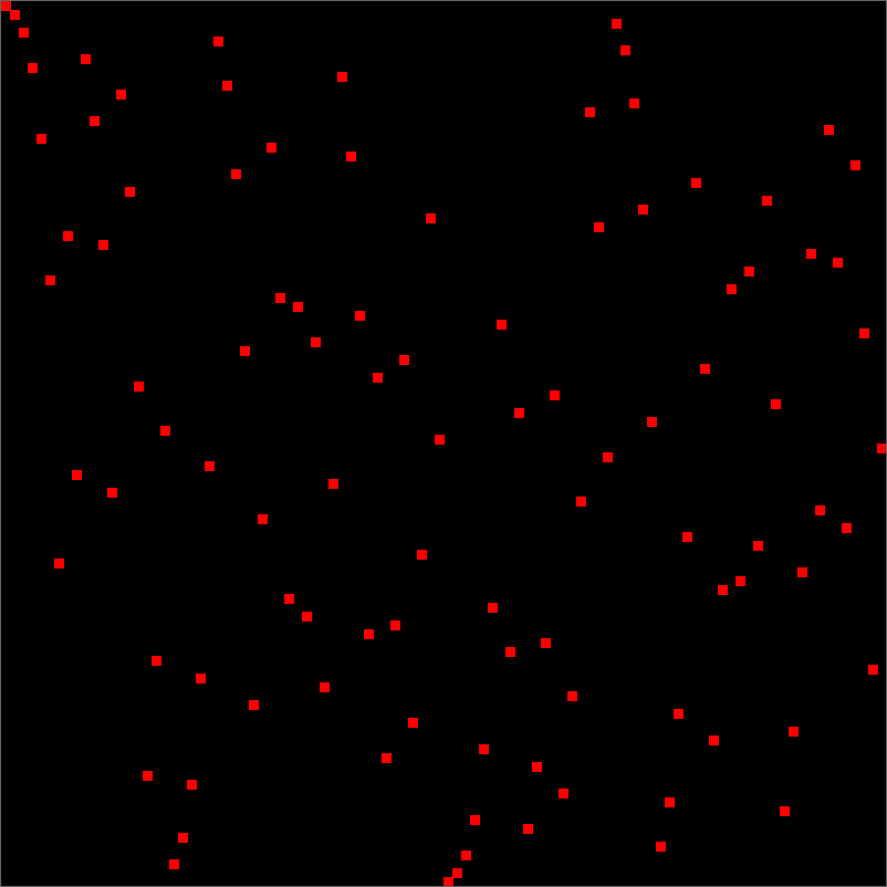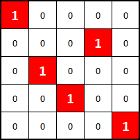 A Golomb ruler has no identical distances between any of its coordinates in one dimension. A Costas Array is a similar construct but this time, rather than marks on a line, it is a collection of points on a square grid. The points are selected so that there is exactly one point in each row, one point in each column, and importantly the vector displacement between any pair of points on the grid is unique! (Those interested in this topic, might also be interested in the Eight Queens Puzzle. By definition, a Costa Array must also solve be a solution to an n-rooks problem). An example order 5 Costas Array is shown on the left. |