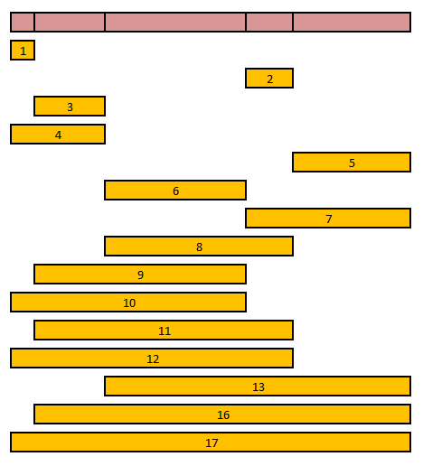 To the left is an example of an optimal order 6 ruler. It has a length of 17 units. (No shorter ruler with 6 marks exists that does not duplicate any measurement). This particular ruler is not perfect. It measures all distances up to its length with the exception of 14 and 15. It has been proven the no perfect Golumb ruler exists that has an order higher than 4. For certain orders, there is more than one optimal solution, but for most orders, the optimal Golumb ruler is unique (Saving, the trivial reversal obtained by rotating the ruler 180 degrees). As you can imagine, the calculation of optimal Golomb rulers is computationally complex, and at the time of writing optimal solutions up to order 26 have been discovered. |
