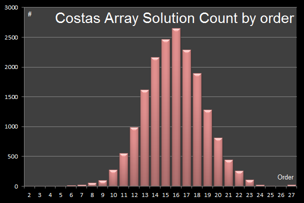![]() Whilst the total number of solutions is not know above order 27, there are an infinite number of Costas arrays. (There are systems that can be used to generate them which work near prime numbers and powers of prime numbers.) Interestingly, at the current time, there are no known Costas Arrays of order 32 or order 33! |