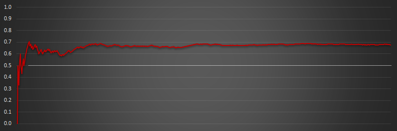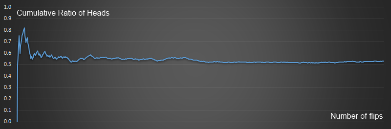 A perfectly symmetrical coin, theoretically, has a totally unbiased outcome. It should land 50% of the time on heads, and 50% of the time on tails. As discussed above, it’s a memoryless system. The coin has no internal concept of how many times it has been flipped in the past (if at all). It has no memory of what any past results were. It is agnostic, and all flips are independent. (Mathematicians describe these events as Bernoulli trials). Sure, there is randomness. But over time, with a large number of trials, these things settle down. Below is an example graph showing flipping a coin 500 times. The x-axis shows the number of flips, and the y-axis shows what percentage of the outcomes are Heads. You can see that, over time, the graph settles down to the an expected value of near to 0.5 |