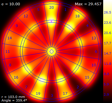 Now that we have a curve to describe the probability of a where a dart will land based on a target and standard deviation, we can sweep this curve over the board and calculate the expected score for each possibly aiming location. (Because of the stochastic nature of the probability distribution function, we simple multiply the probability of the dart landing at a certain location by the point scored at that location, then integrating this for the entire board).