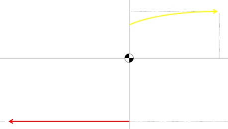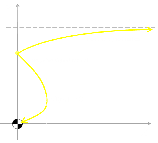 If you elect to take the path that moves you closer to the column, eventually you'll get there! (after passing through an inflection point in the x direction where you reverse direction in the axis). This inflection point occurs when the denominator, above, is zero. When you reach the column you can spin around it in whatever direction you like, maintaining a safe hiding position until the monster's train passes out of lethal range. |