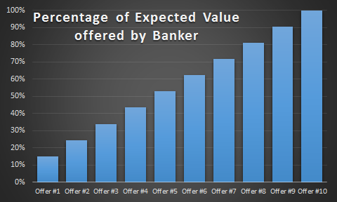 It is ‘mathematically’ advantageous to say “No Deal” until he does make an offer at least has high as the expected value. There is, however, more to the story than this, but before we pursue that path let’s take a detour and see a little bit more of what the Banker appears to do … |