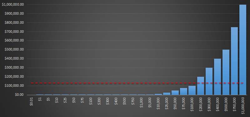 That was a particularly extreme example, but what about something with less range? If the difference was between cases containing $200k and $300k, what offer would the banker have to give to persuade you to take his offer instead? Mathematically, you’d say $250k, but would you take just $220k instead? (a 10% premium on the lowest you could, otherwise, walk away with), or would it take more?