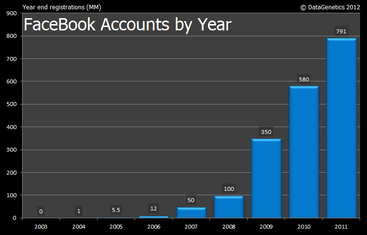 Another strong year of growth for Facebook, who finished 2011 with just short of 800 million registered accounts. Below is a chart of their year-end registrations since inception.