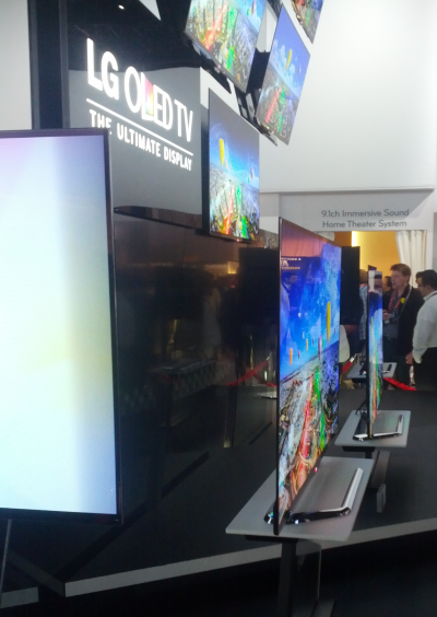 Both LG and Samsung were displaying curved screen TVs. The curves, whilst slight, were noticeable (Imagine a TV shape cut-out from the wall of a large diameter cylinder). Both of the screens were OLED, so were incredibly thin.