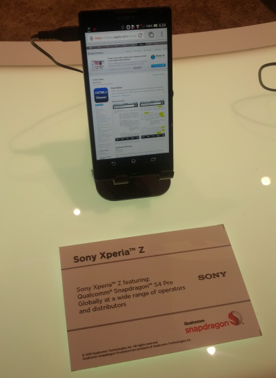 Qualcomm had a very busy show, and took over the Keynote speech after Microsoft's departure. One of their big pushes was Snapdragon S4; their answer to low-power, high performance processors for todays mobile device needs. Snapdragon processors power many devices including the new Sony Xperia Z smart phone shown here.