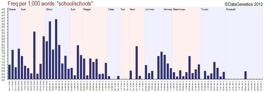 This is really interesting. Look at the chart for references to tonight. Before Jonhnson, there was no reference to the word in any of the speeches. Why is this? I don't know enough about the history of the addresses (perhaps a reader of this blog can educate me?), but I suspect that 1965 may have been the year they changed the timing of the event to occur around 9:00 pm EST?