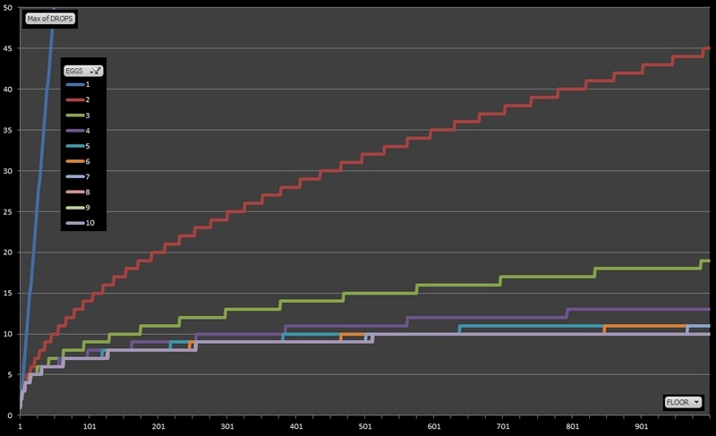 Here's the data plotted in graphical form. The y-axis represents the worst case number of drops needed to find the solution. The x-axis represents the number of floors in the building being tested (from 1 – 1000). There is a distinct line for each number of eggs.