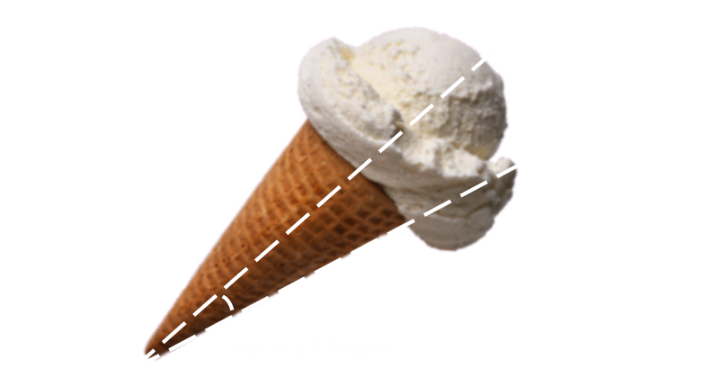 The volume of a cone is easy to calculate (It's 1/3 of that of a cylinder of the same height). However, we need to account for the angle of the cone. Choose too narrow a cone, and there will be a lot of wasted space below the ice cream. Choose too broad a cone, and the wasted space is around the edge of the ice cream ball. |