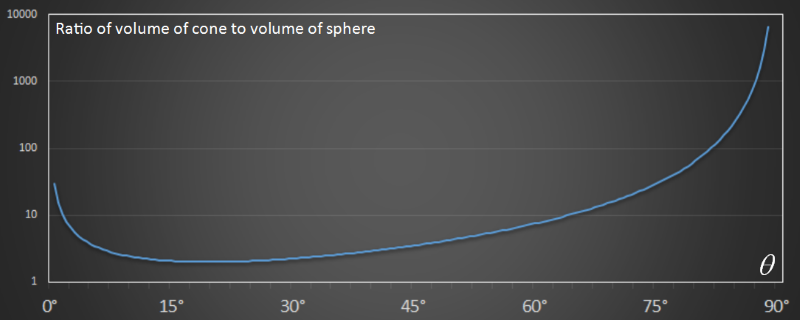 When the cone is very sharp, pointy and trumpet like, with a very small angle, the cone has a high volume relative to the sphere (It's not defined at exactly 0°). As the cone angle increases, the ratio of volume falls to some minimum (which we'll calculate later), then increases again.