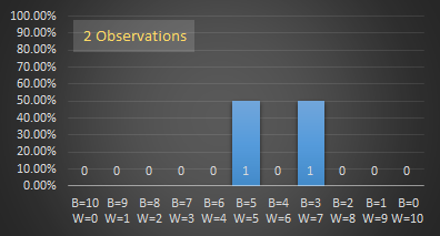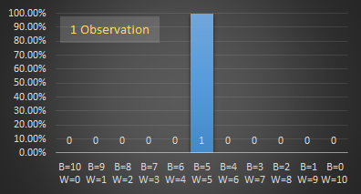 On each graph, the x-axis shows the breakdown of balls in the sample, with the far left representing all black balls, and the far right representing all white balls. For each combination of marble mixture there is a bar column showing the number of times this combination of marbles was selected. The y-axis shows what percentage (of all the experiments run) each bar represents. With just one trial, the bar is at 100%, for two trials, both are 50%, (assuming a different distribution of marbles was drawn). The fancy term for this is ‘normalization’ and allows the graphs to all be drawn on the same scale, irrespective of the number of experiments performed.