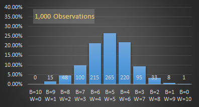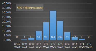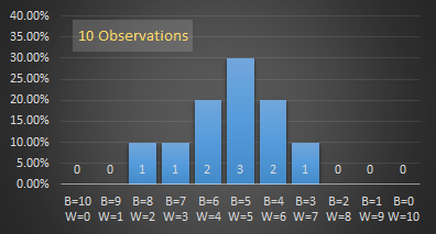 Imagine you have a Greek Urn, and inside it are 100 marbles. There are 50 black marbles and 50 white marbles (all thoroughly mixed). An equal combination. You close your eyes and pick out ten balls, at random, from the urn. Then you open your eyes and examine the results. What’s the most likely result? Common sense tells you that, most likely, you’ll get five black marbles and five white marbles (and the math backs this up; it is the most likely outcome). But it would also not rock your world if you drew six of one color and four of another. You’d probably also not lose sleep if you drew seven of one color and three of the other either. It’s less likely that you’d get this asymmetry, but it is possible. It is even possible for all ten drawn marbles to be black (just not likely, in fact less six chances in ten thousand, but if you did it enough times, it could happen). And let’s not even mention what would happen if we sampled in batches of nine, not ten (where it is not even possible to draw an equal number of black and white marbles!) |